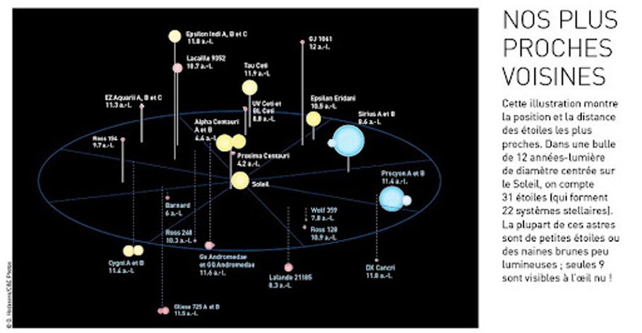 Der nächste Stern zu unserem Sonnensystem ist Proxima Centauri im Sternbild Zentaur. Er ist 4,3 Lichtjahre entfernt. Polaris (der Nordstern) ist 440 Lichtjahre entfernt. Sirius, der hellste Stern, ist bis Mitte Mai am Abendhimmel sichtbar und 8,9 Lichtjahre entfernt.