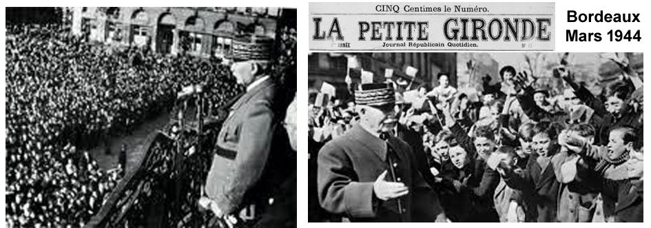 Unter diesen Zeitungen war auch La Petite Gironde. Auf dem Place du Théâtre in Bordeaux war Pétain angekommen, und die jubelnde Menge war so groß, dass es hieß: „Man hätte keine Nadel durch die Menge stecken können.“ Er wurde verehrt. Er war der Sieger von Verdun. Doch das Außergewöhnliche ist, dass dieses Ereignis im März 1944 stattfand!