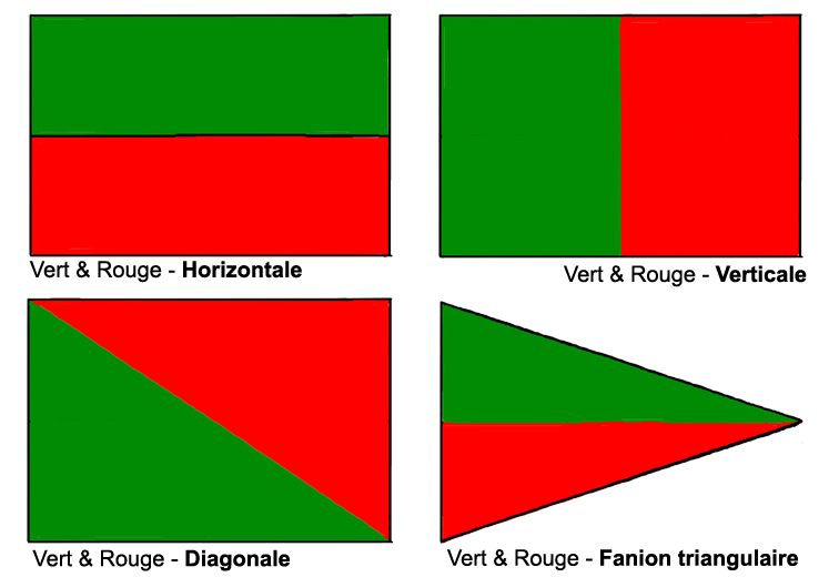 • Segundo: Los colores se leen en el orden verde y luego rojo, de izquierda a derecha. «En los banderines, el verde se coloca en el asta, en la parte inferior del banderín, cortado en diagonal desde la parte superior del asta hasta la punta inferior del banderín; el rojo se coloca en el lado opuesto». (Ver figura. Verde y Rojo - Diagonal)