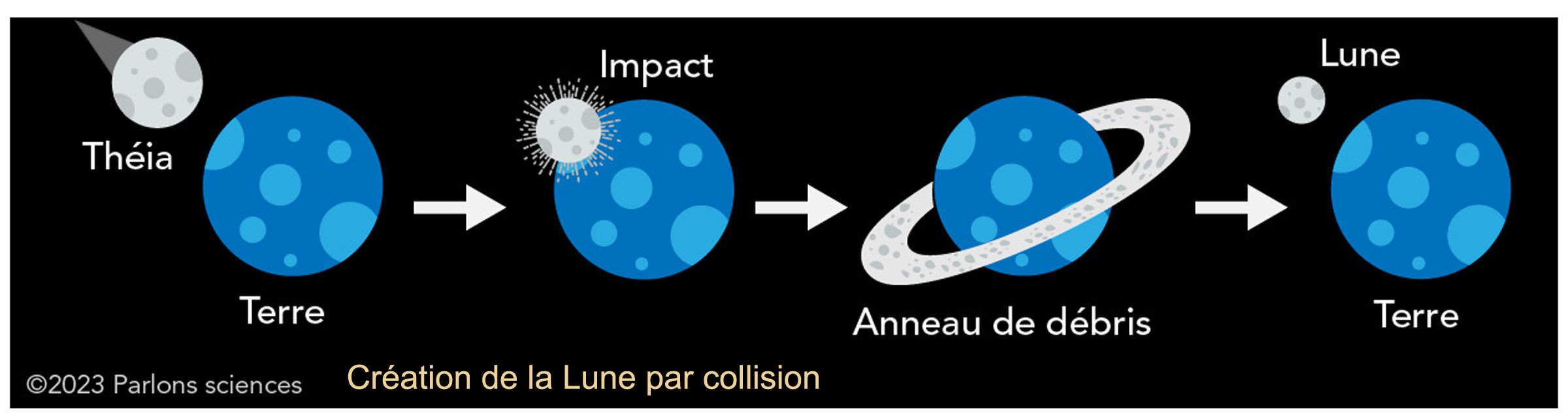 Notre satellite, la Lune, est né d’une formidable collision il y a 4,5 milliards d’années : celle de la toute jeune Terre avec un astre de la taille de la planète Mars, (deux fois plus petite que la Terre). Sous la violence du choc, une partie du manteau de notre planète aurait été pulvérisée. Ces débris, éjectés dans l’espace, auraient ensuite formé un anneau de matière autour de la Terre, avant de s’agglomérer très vite pour donner naissance à un seul corps céleste : la Lune.